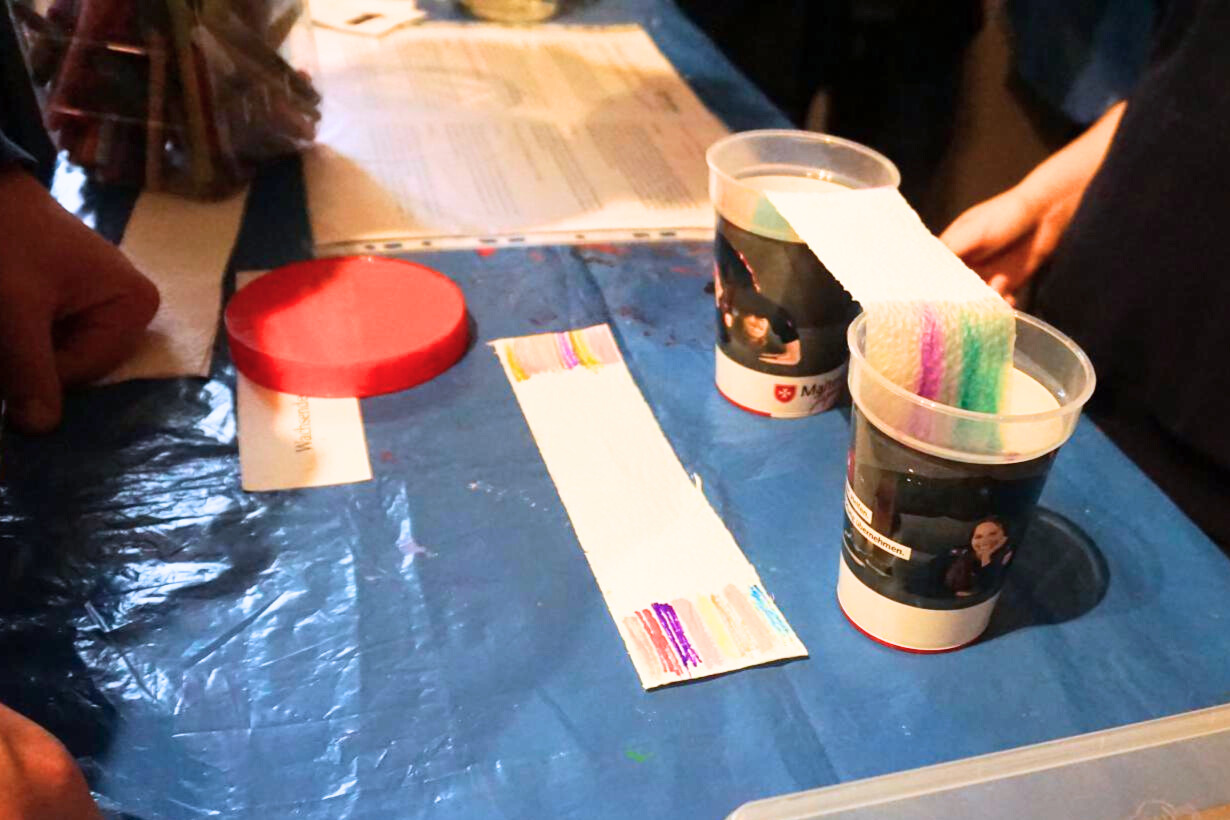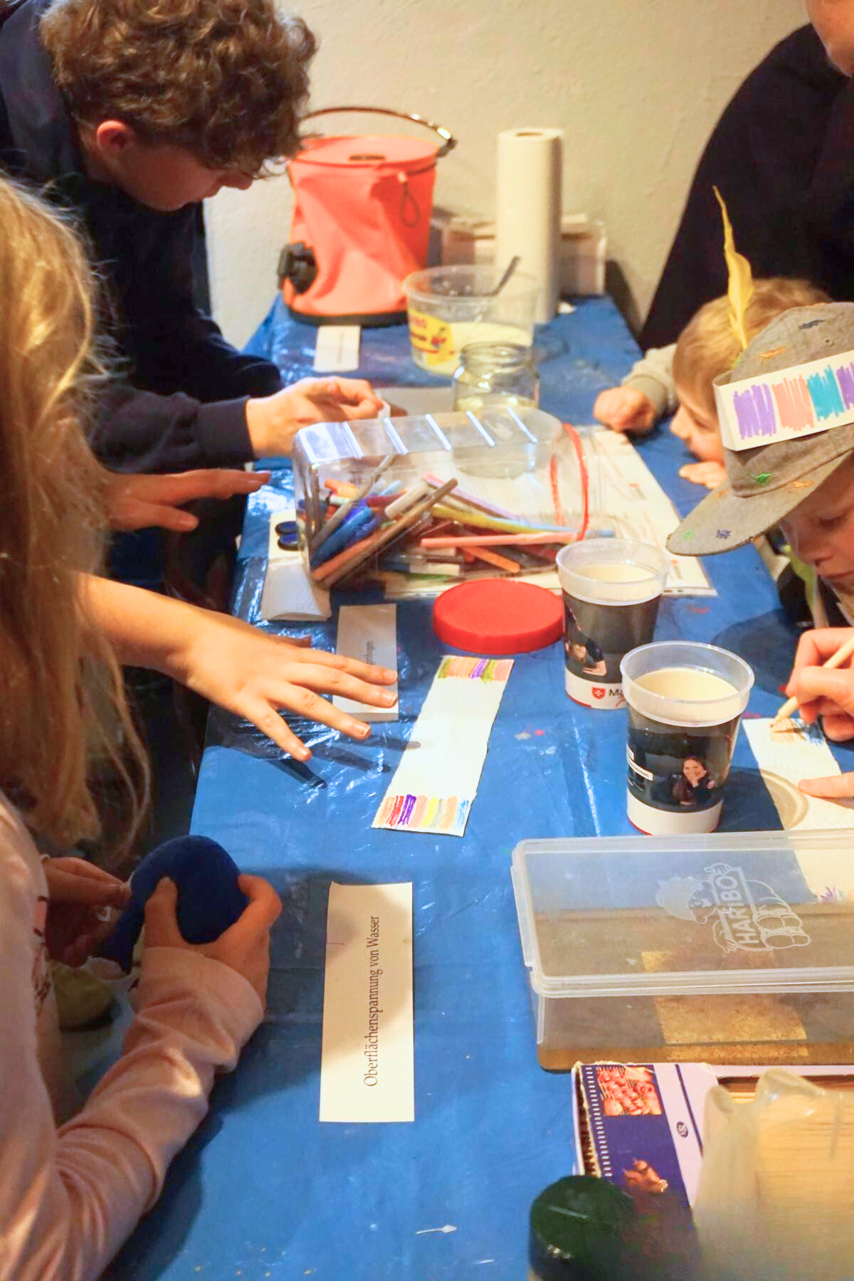 Die einzelnen Angebote waren übersichtlich an mehreren Tischen rund um das Glücksrad aufgebaut. So konnten die Kinder selbst wählen, welche Aufgabe sie als Nächstes ausprobieren möchten. Nach erfolgreichem Abschluss einer Challenge durften sie sich am Glücksrad einen kleinen Preis aussuchen.